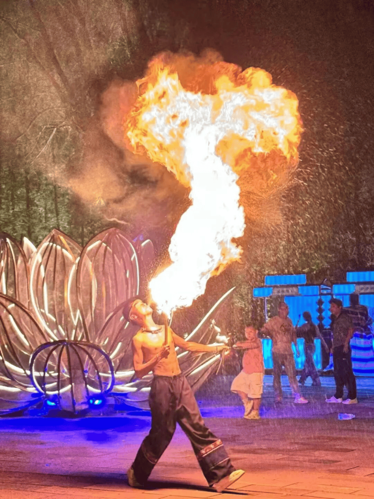 鲁源村震撼上新,阳朔同款龙船破水而行,水上火壶舞动璀璨流光,绚丽烟火共绘夜空,泽木广场“火舞钢花”,铁水腾空一瞬间,顿时化作星满天。尼山至圣广场数百架无人机空中作画,硬核告白祖国!万千彩灯点亮梦幻秋夜,与出圈“鲁源女神”合影打卡,随手拍出氛围感大片。