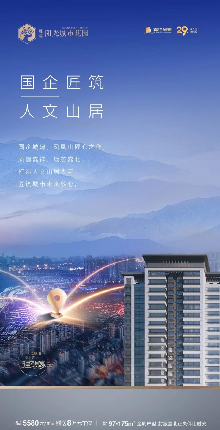 阳光城市花园国企城建,凤凰山匠心之作,质造嘉祥,焕芯嘉北,打造人文山居大宅,匠筑城市未来核心。单位团购价5580元/㎡起,赠送8万元车位。