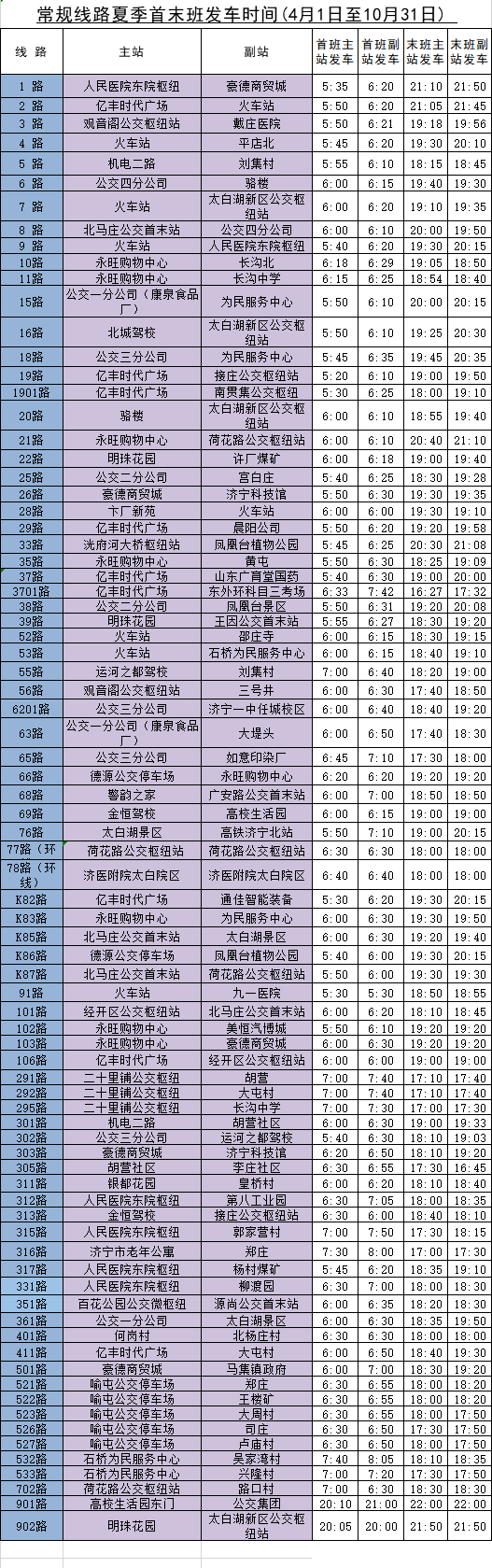 出行注意!结合往年客流出行特点,4月1日~10月31日,济宁公交集团对所属常规运营线路执行夏季运营时间。