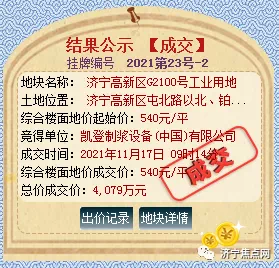 土地位于:济宁高新区屯北路以北、铂金大道以东;土地面积:75537㎡(约113亩);土地用途:工业用地;出让年限:50年;容积率不小于1.0;起始价:4079万元,综合楼面价起价:540元/㎡;交付条件为净地(执行标准化供应);最终成交价为:4079万元(约36万元/亩),综合楼面地价成交价:540元/㎡;溢价率:0.0%;