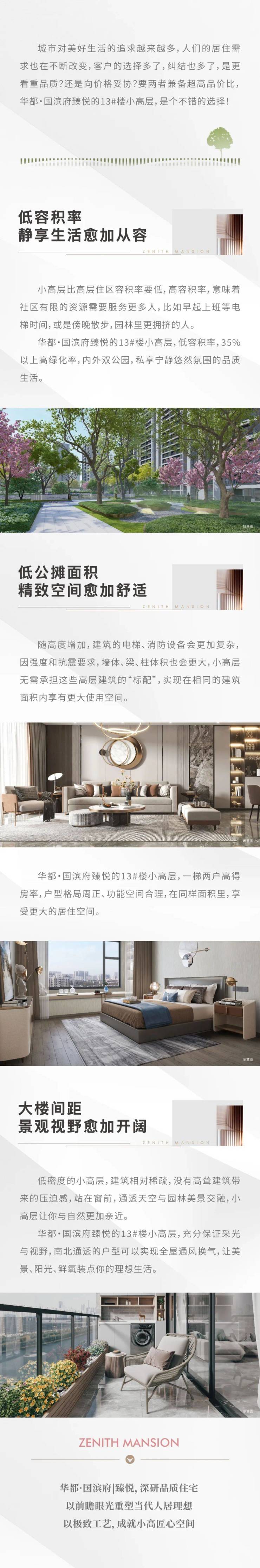 低密度的小高层,建筑相对稀疏,没有高耸建筑带来的压迫感,站在窗前,通透天空与园林美景交融,小高层让你与自然更加亲近。华都国滨府·臻悦的13#楼小高层,充分保证采光与视野,南北通透的户型可以实现全屋通风换气,让美景、阳光、鲜氧装点你的理想生活。