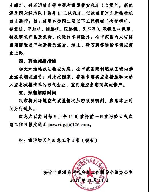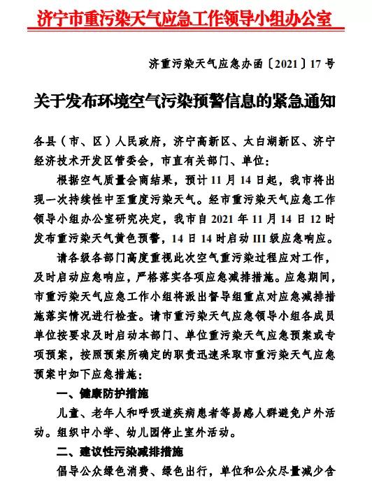 根据空气质量会商结果,预计11月14日起,济宁市将出现一次持续性中至重度污染天气。经市重污染天气应急工作领导小组办公室研究决定,济宁市自2021年11月14日12时发布重污染天气黄色预警,14日14时启动Ⅲ级应急响应。