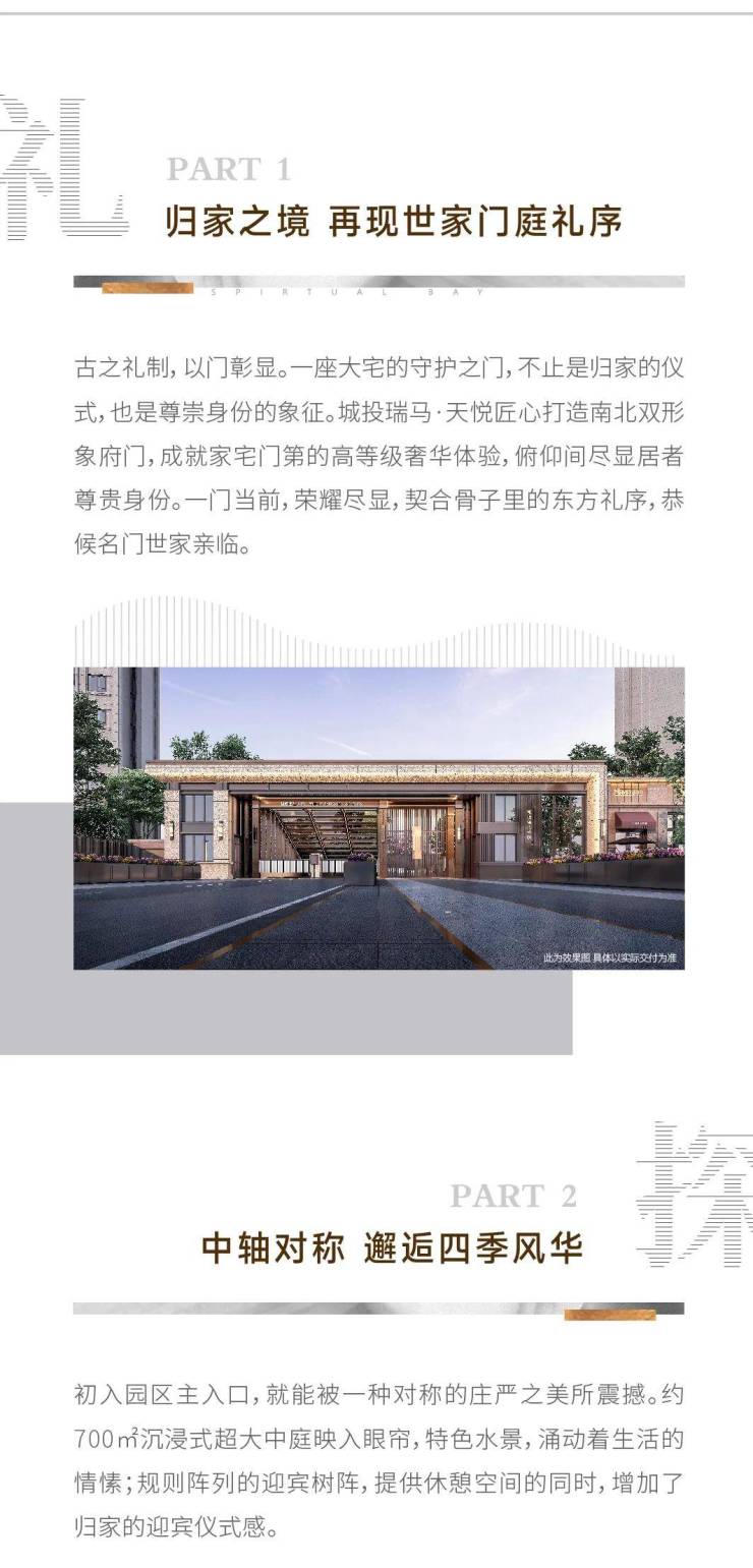 古之礼制,以门彰显。一座大宅的守护之门,不止是归家的仪式,也是尊崇身份的象征。城投瑞马·天悦匠心打造南北双形象府门,成就家宅门第的高等级奢华体验,俯仰间尽显居者尊贵身份。一门当前,荣耀尽显,契合骨子里的东方礼序,恭候名门世家亲临。