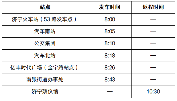 (三)停靠站点:济宁火车站(53路发车点)、汽车南站、公交集团、汽车北站、亿丰时代广场、南张街道办事处、济宁殡仪馆
