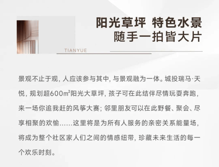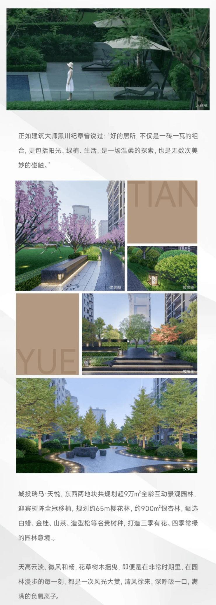 城投瑞马·天悦,东西两地块共规划超9万㎡全龄互动景观园林,迎宾树阵全冠移植,规划约65m樱花林,约900㎡银杏林甄选白蜡、金桂、山茶、造型松等名贵树种,打造三季有花、四季常绿的园林意境.。