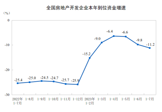 国家统计局数据显示,1-7月份,房地产开发企业到位资金78217亿元,同比下降11.2%。