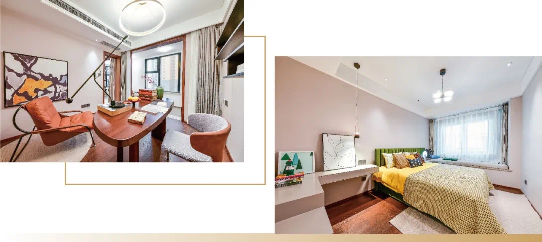 这份关于居住空间的精神共鸣,在60#另一建筑面积约144㎡的四室洋房中亦能听到回响。于128㎡户型的设计基础上拓宽空间尺度,增设独立书房,在此遨游书海;一方主卧空间,不仅能安放宽大称心的卧榻,更布局卫浴区、衣帽间、飘窗,将居者生活的私密性与身份的尊崇感精准诠释。起居有序、不被打扰,于此身心得以从容安放。