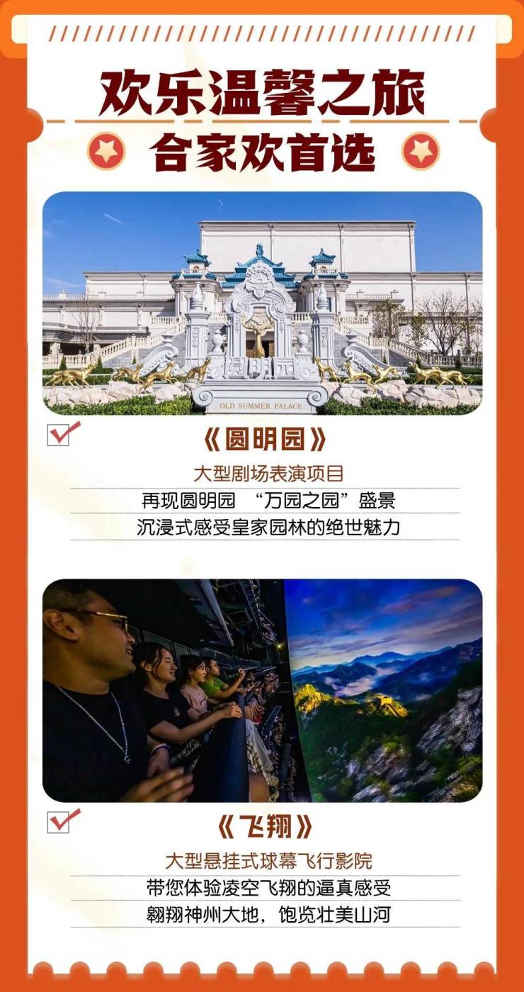 项目综合运用AR、VR、巨幕、球幕等行业前沿技术,打造出《圆明园》《致远 致远》《都会大剧院》《鹰击长空》《铁道游击》《飞翔》等一系列集参与性、互动性、体验性于一体的高科技游乐项目。园区内还有萌趣可爱、让小朋友流连忘返的《熊出没》主题区,更有各种精彩演艺、缤纷夜场活动、特色美食餐厅,可以为全年龄层游客提供“一站式”休闲旅游服务,是适合合家出游的欢乐目的地。
