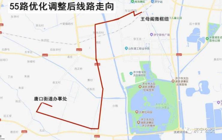 55路拟调整为:从“唐口街道办事处”发车,沿人民路向西至京珠线,沿京珠线向南至工业路,沿工业路向东至发展路,沿发展路向南至原线路,沿原线路运营至安澜路,沿安澜路向北至车站西路,沿车站西路向东至环城西路,沿环城西路向南至杏林路,沿杏林路向东至荷花路,沿荷花路向南至终点站“王母阁微枢纽”。