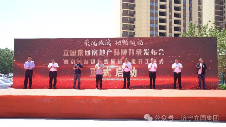 市住房保障中心副主任王力、任城区住建局局长李庆峰、市品牌促进会会长秦烨伟、市房地产协会秘书长孙保亚、任城区济阳街道党工委书记王灿、立国集团董事长王成国、立国集团总经理王杰以及山水比德设计院院长孙述虎共同启动立国集团房地产品牌升级发布会暨京杭名都景观园林升级开工仪式。