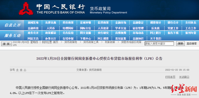 1月20日消息,中国人民银行授权全国银行间同业拆借中心公布,2022年1月20日贷款市场报价利率(LPR)为:1年期LPR为3.7%,此前为3.8%,这是连续第二个月下调;5年期以上LPR为4.6%,此前为4.65%,这是连续20个月维持不变后的首次调整。