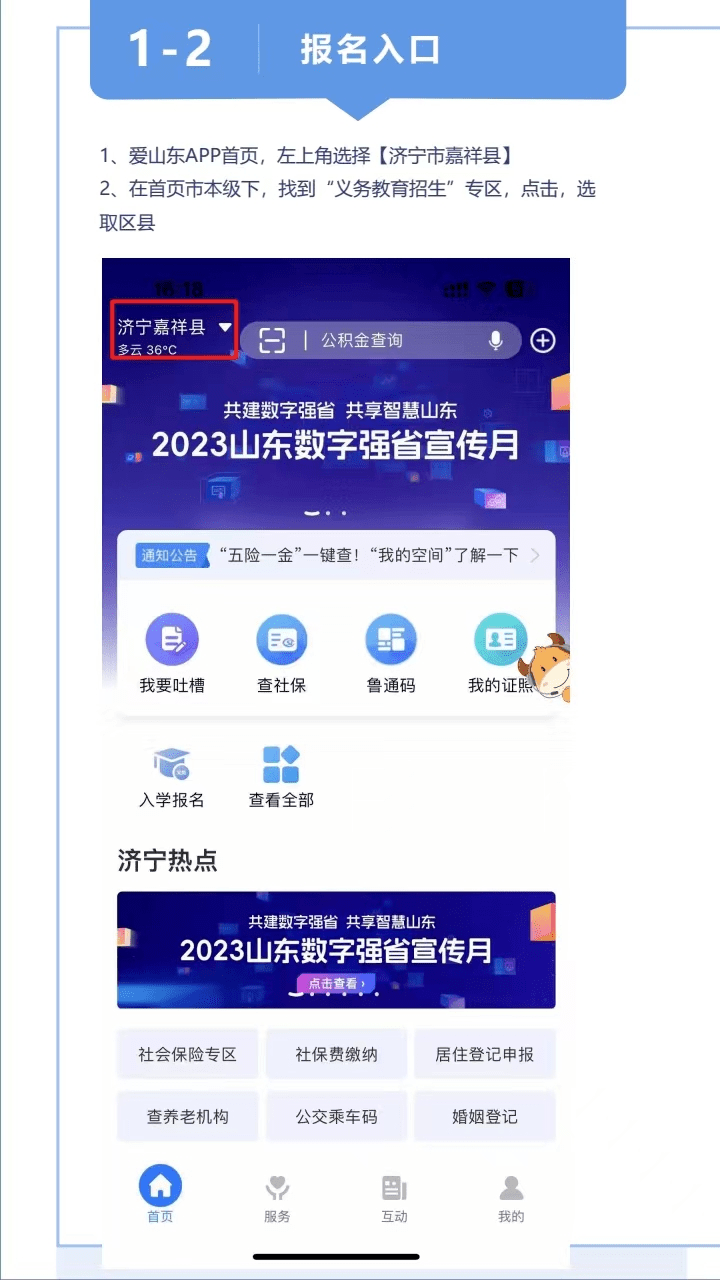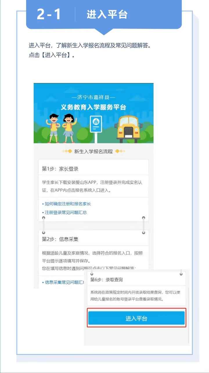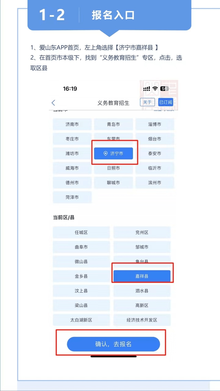 根据省、市要求,今年继续推进城区义务教育招生入学“网上办”“掌上办”,搭建招生平台,实现一网通办,实现招生工作全流程信息化管理,让数据多跑腿、家长少跑腿。符合城区学校入学条件的学生,8月23日至24日,需要学生父母或法定监护人用手机下载安装“爱山东”APP,注册后实名认证(建议以房户一致的监护人实名认证),“爱山东”APP首页左上角,地区选择“济宁”→在首页点击“义务教育招生”,再选择“济宁”→“嘉祥”,进入“嘉祥县义务教育招生报名平台”,选择对应的报名类型,完成相关信息填报,提交申请。报名后学校组织初审、复审,县教育和体育局将会对招生过程的全过程进行抽审和监督。网上审核通过的,不再需要到学校现场提供证明材料。