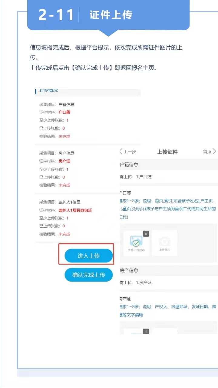 (1)学校招生范围内有城区户籍、有房产类型。报名时有房产证的上传房产证、户口首页、户口索引、家长户口页、学生户口页等照片;交房入住没房产证的上传购房合同、购房发票、交房专项维修基金单据、开户费单据、水电物业费单据、户口索引、家长户口页、学生户口页等照片。