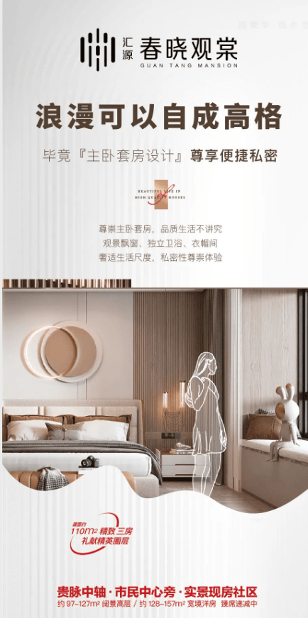 汇源春晓观棠尊崇主卧套房,品质生活不讲究观景飘窗、独立卫浴、衣帽间奢适生活尺度,私密性尊崇体验。
