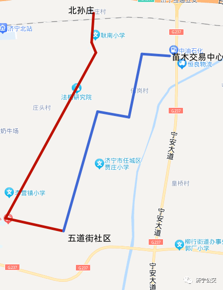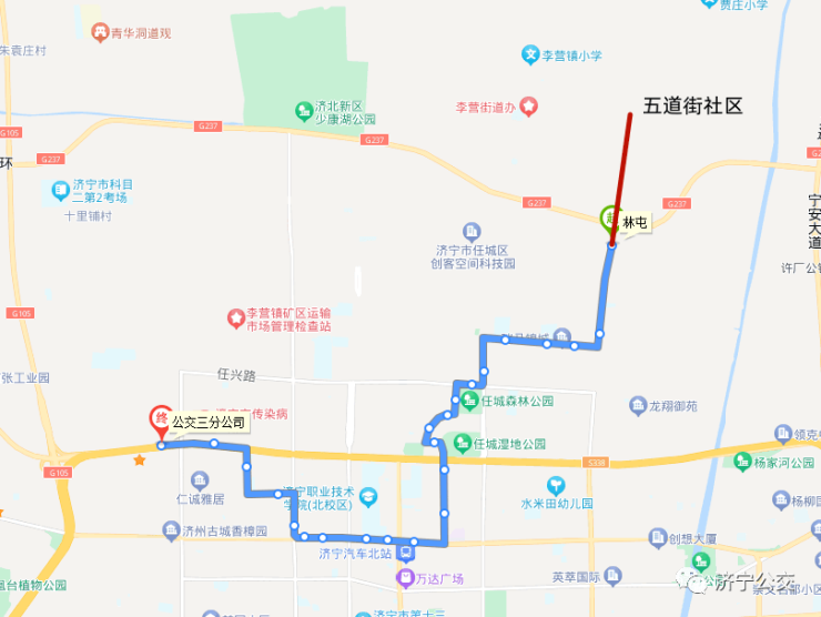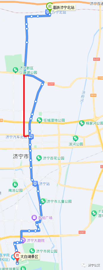 自高铁北站起,沿站前路、济北旅游大道、共青团路、金宇路、建设路至原线路,终点站荷花路公交枢纽站,撤停实验中学、任城区疾控中心、建设路任通路、平安花园、李营街道卫生院共5处公交站点。