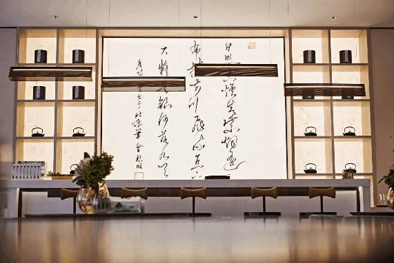 琴棋书画,诗酒花茶,大抵是当代人们最向往不过。设计师循着这份美好心音,于湖畔雲庐生活美学馆一层空间,规划湖畔学堂、云闲禅院、玉泉茶馆、月影书屋、健康小屋及太白集六大主题功能区域,将李白诗词意境、书法笔墨、运河文化注入空间的表达,营造沉浸式体验。