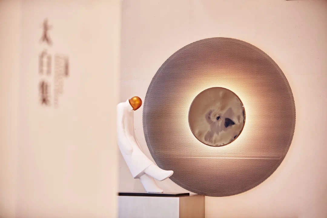 如此唯美闲适的意境,于湖畔雲庐生活美学馆中比比皆是。如水吧处的黑白灰圆形挂饰,将流转的时光折叠进褶皱里,宛若一幅铺陈的写墨山水寄居皎皎圆月的画卷,引人浮想翩翩,生发诗意情志。