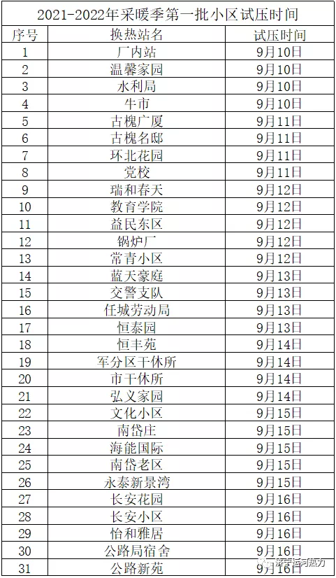 目前,运河热力供热系统已整体具备试压条件,自2021年9月10日起,我公司将依次分批对区域内小区进行注水试压,请广大热用户及时关注您所在小区的试压时间、注意事项及相关信息,在试压时间内请务必家中留人,防止设施漏水损坏物品。同时,小区试压完成后,供热系统即进入带压冷循环状态,请广大热用户不要随意改动、拆卸供热设施,以免发生漏水情况造成不必要的损失。