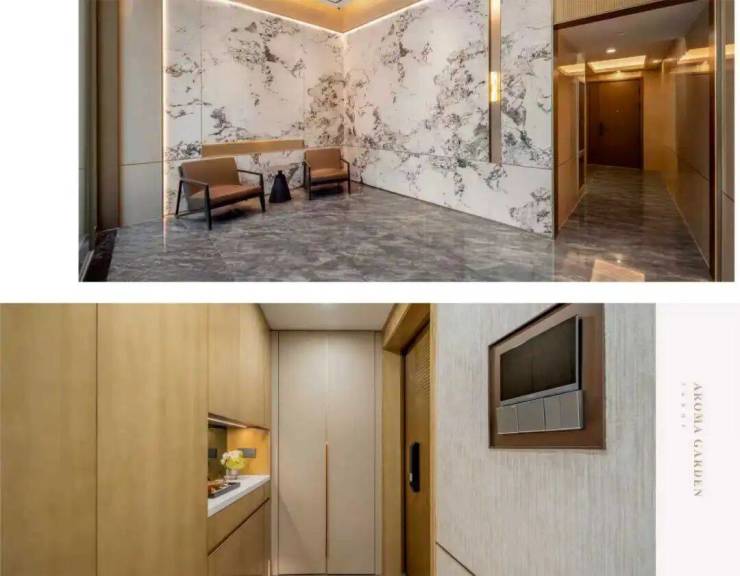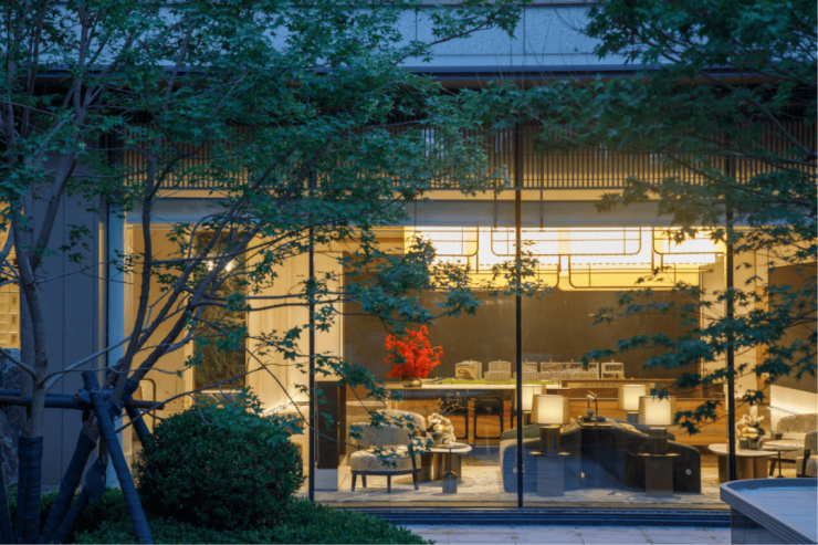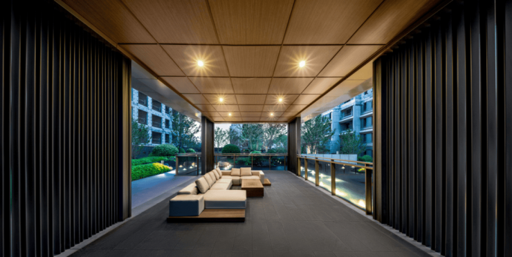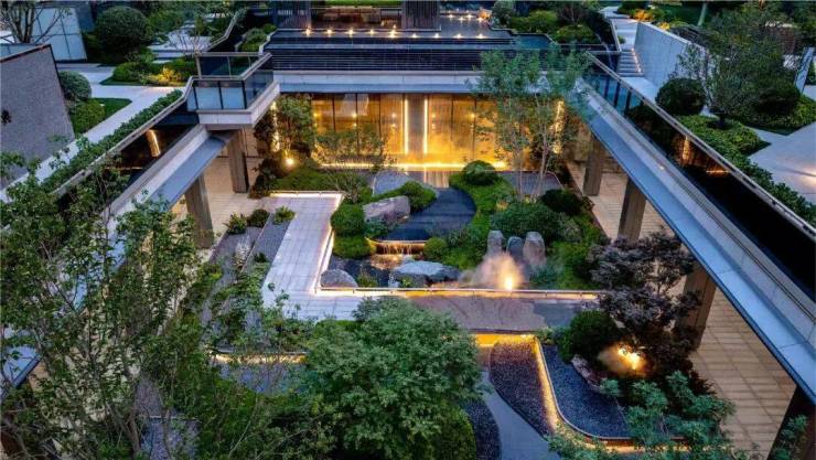 借地势高差勾勒【坐石枕流】水景,叠水与葱茏绿意相映,大面积玻璃窗将园林盛景“框”成动态画,织就出立体山水的层次之美,实现“人在景中住,景在画中游”的诗意人居。
