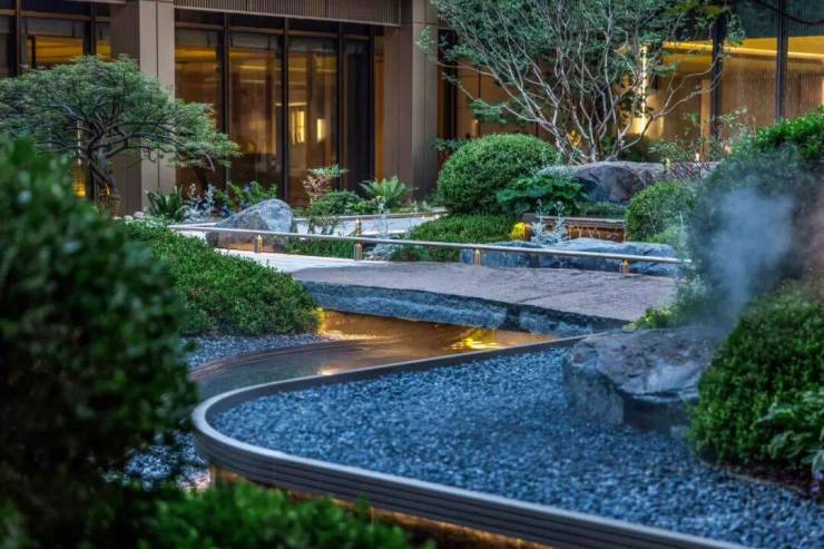 移步示范区,实景所呈的【水院空间】,作为景观核芯,既是俯瞰庭院的观景台,亦是自然与建筑对话的媒介。清风穿林,水声潺潺,晨时可观阳光与叶影嬉戏,午后可在树荫下静享阅读,这方秘境,诠释着自然与生活共生的真谛。