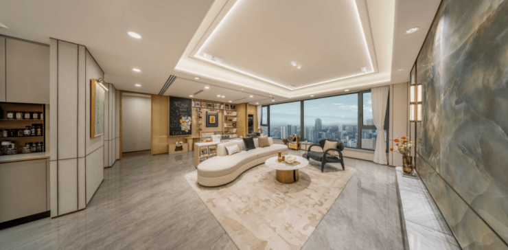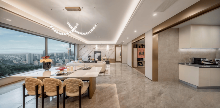 客厅、餐厅、厨房作为居家生活中最活跃的动态区域,建筑面积约142㎡宽境户型样板间,通过南北一体化贯通设计,分而无界,放大空间尺度,演绎高阶生活的理想。