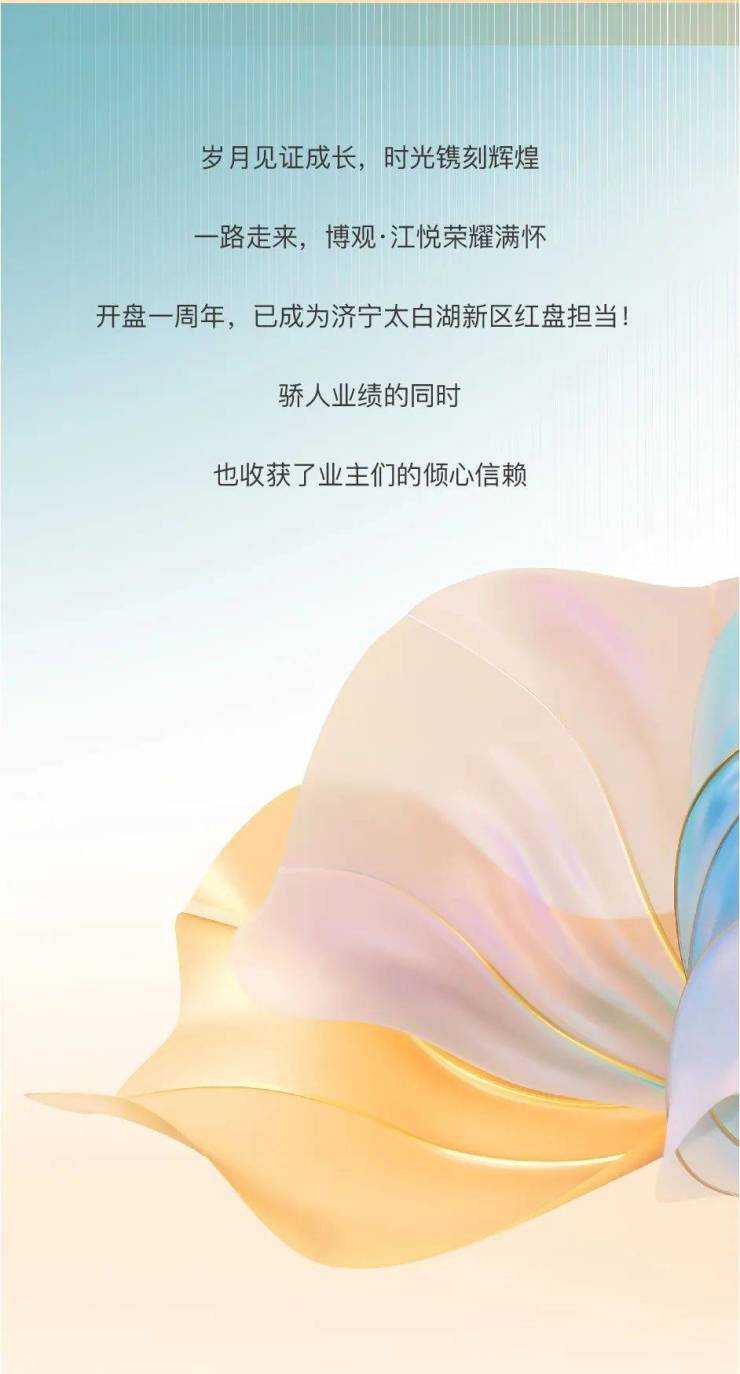 2021年7月18日,博观·江悦耀世开盘,开盘当天劲销6亿,先进太白湖。此后屡开屡捷,开盘1周年劲销14亿,连续三个季度登上济宁商品住宅销售金额太白湖新区TOP1(数据来源:中指研究院),以其毋庸置疑的实力与品质,持续受到高净值客群的追捧。