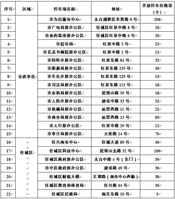 市为民服务中心等45家单位内部停车场排名前列批向社会免费错时开放;其他具备条件的机关事业单位根据情况,分期分批稳步推进开放工作。