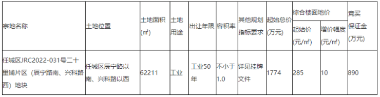 土地位于:任城区辰宁路以南、兴科路以西;土地面积:62211㎡(约93亩);土地用途:工业用地;出让年限:50年;容积率不小于1.0;起始价:1774万元,综合楼面价起价:285元/㎡;