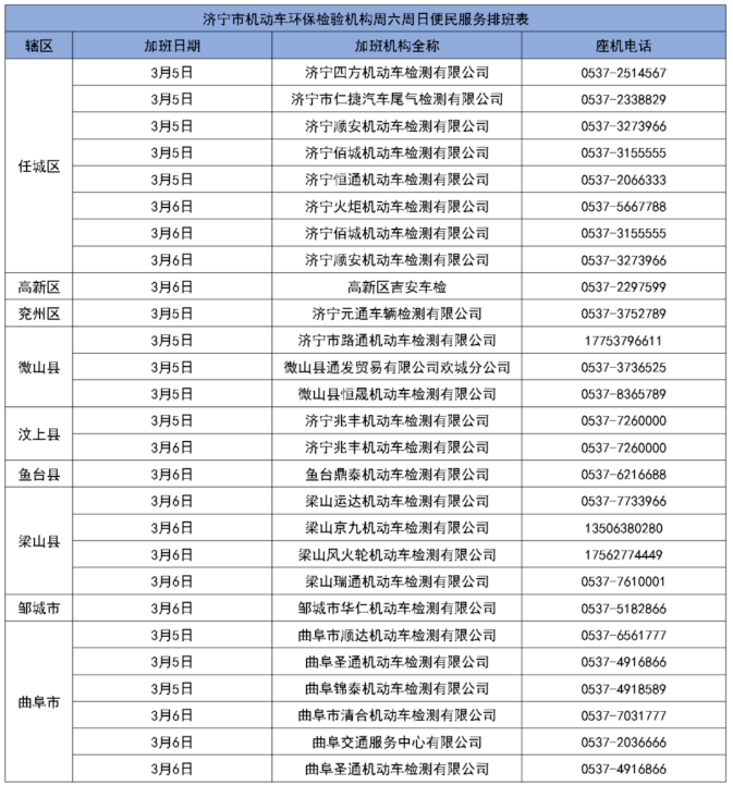 来了!济宁市机动车环保检验机构周末便民服务名单出炉