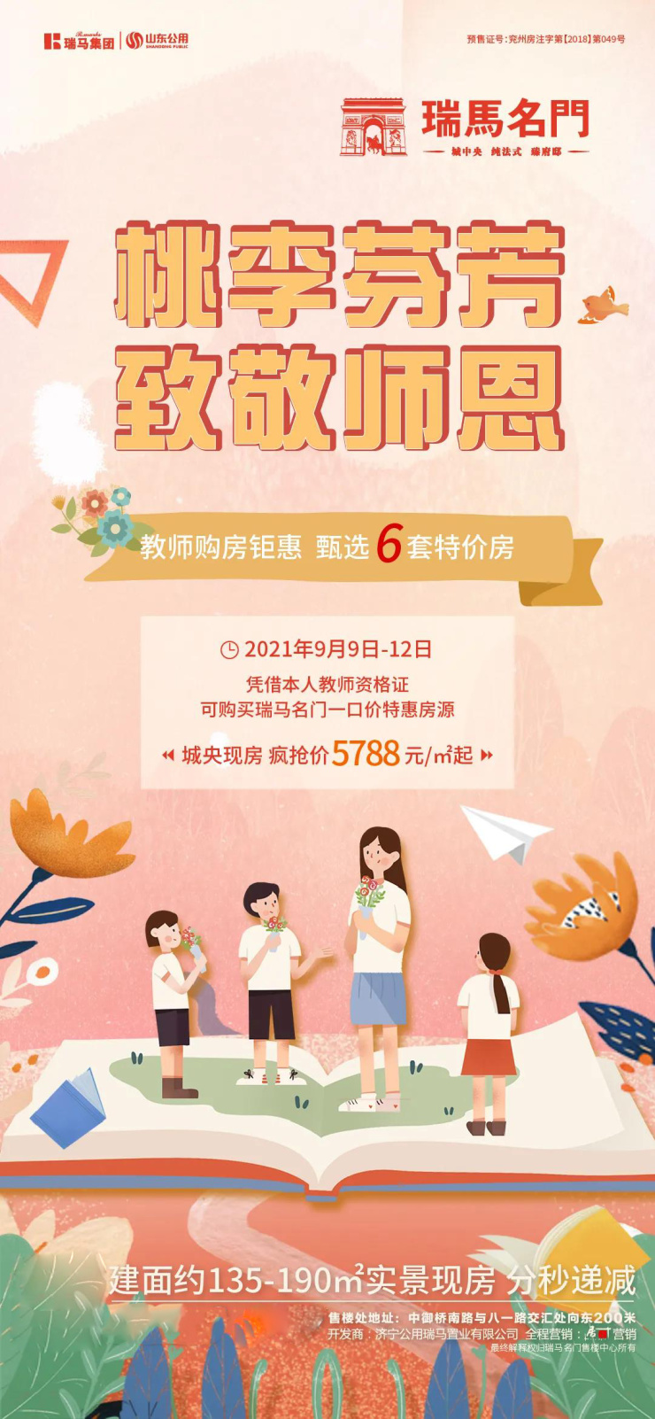 桃李芬芳,致敬师恩。兖州瑞马名门,教师节购房钜惠 甄选6套特价房,凭借教师资格证可购买兖州瑞马名门一口价特惠房源。活动时间2021年9月9日—12日。