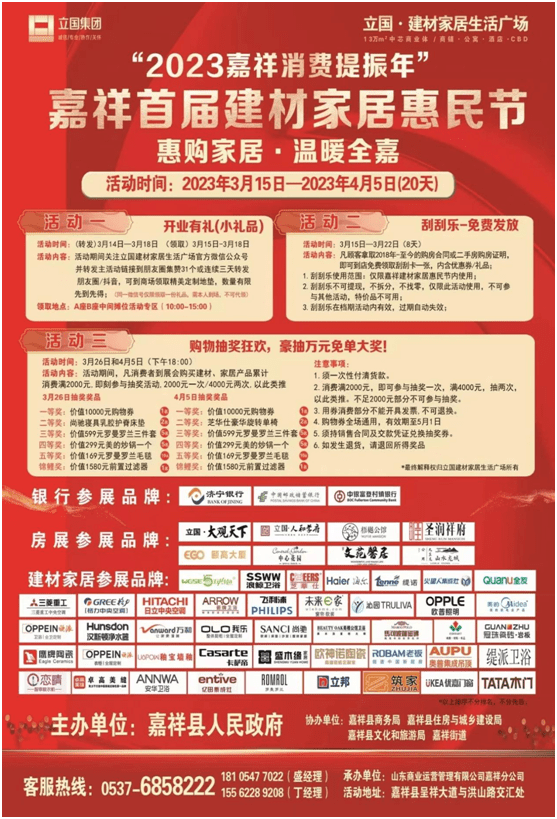 本次“2023嘉祥消费提振年”嘉祥首届建材家居惠民节暨立国建材家居广场盛大开幕活动从3月15日-4月5日为期20天,3.26日与4月5日还有现场抽奖活动,万元免单等众多大奖,买建材 选家居就来“嘉祥首届建材家居惠民节”专场活动,更多钜惠福利不要错过!