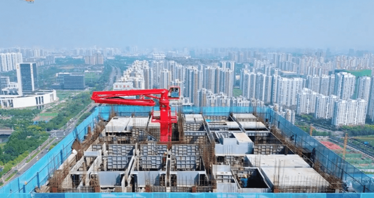 主体结构采用新型的“铝模板+爬膜”施工体系,极大缩减了主体结构的施工周期,混凝土泵送采用“超高压双泵送+全自动液压布料机”体系,保证了混凝土浇筑的连续性,垂直运输采用“超大型塔吊+高速施工电梯+井道式电梯”形式。