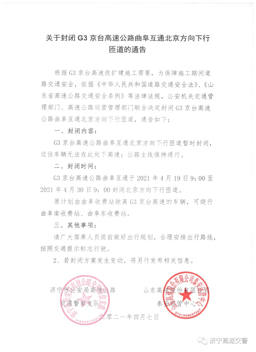 G3京台高速公路曲阜互通于2021年4月19日9:00至 2021年4月30日9:00封闭北京方向下行匝道。