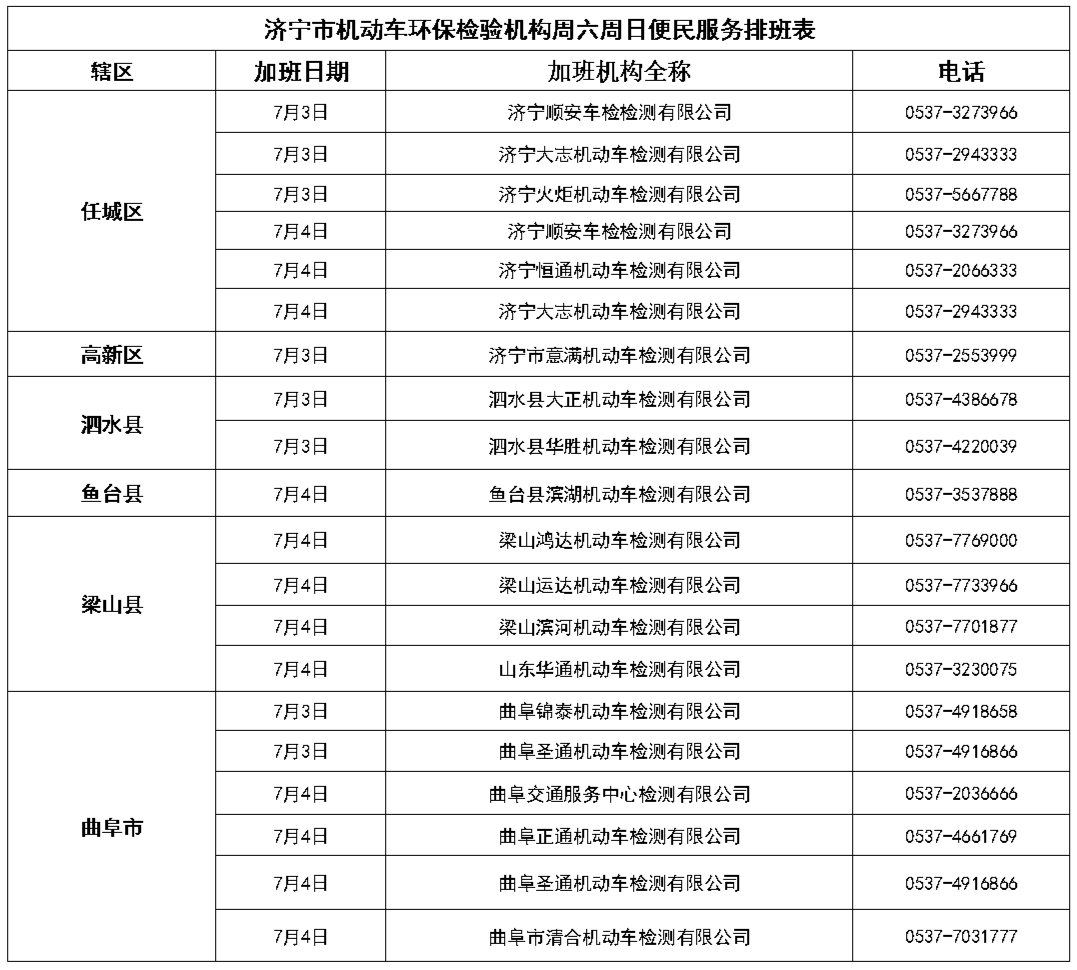 为满足广大车主车辆环检需求,济宁市环保检验机构7月3日、4日,开展周末延时服务,广大车主朋友可通过以下联系方式提前预约机动车环保检测,就近选择检测机构和安排检车时间。