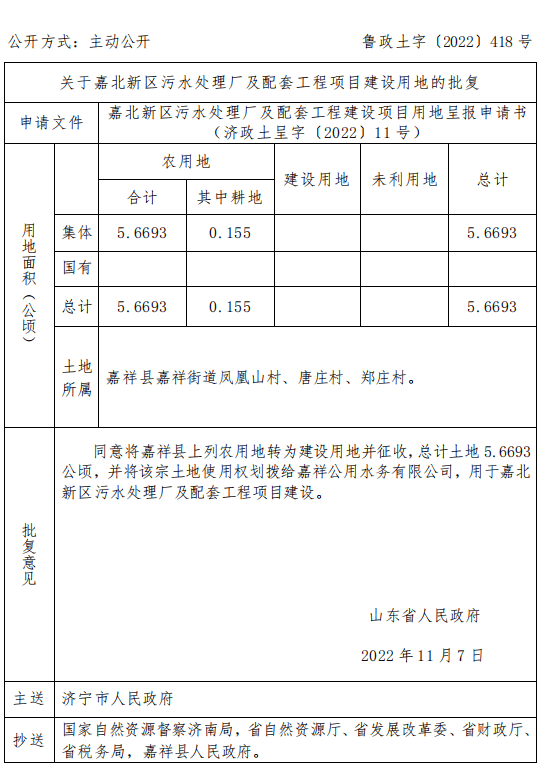 批复意见:同意将嘉祥县上列农用地转为建设用地并征收,总计土地 5.6693公顷,并将该宗土地使用权划拨给嘉祥公用水务有限公司,用于嘉北新区污水处理厂及配套工程项目建设。