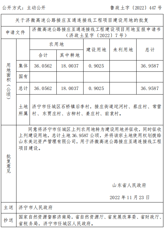 批复意见:同意将济宁市任城区上列农用地转为建设用地并征收,同时征收上列建设用地,总计土地 36.9587 公顷,并将该宗土地使用权划拨给山东美达资产管理有限公司,用于济微高速公路接庄互通连接线工程项目建设。