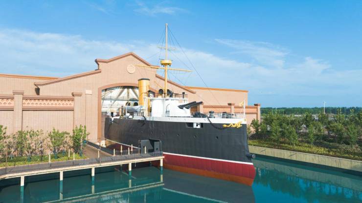 在大型室内有轨漂流项目《致远 致远》中,游客乘坐智能运载船穿过时间长河,置身一个多世纪前巨浪滔天的海战现场,身临其境地目睹民族英雄浴血奋战的壮烈景象,见证北洋水师名舰“致远”号的百年传奇一生。