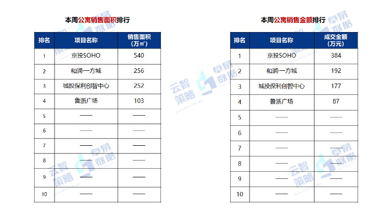 本周京投SOHO项目以销售面积540㎡,销售金额384万元,位居公寓销售面积,金额双排行榜排名前列。
