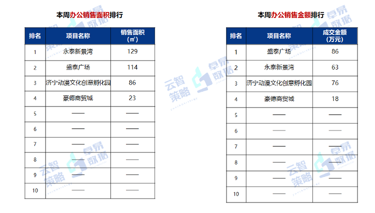 本周永泰新景湾项目以销售面积129㎡位居办公销售面积排行榜排名前列,盛泰广场项目以销售金额86万元,位居办公销售金额排行榜排名前列。