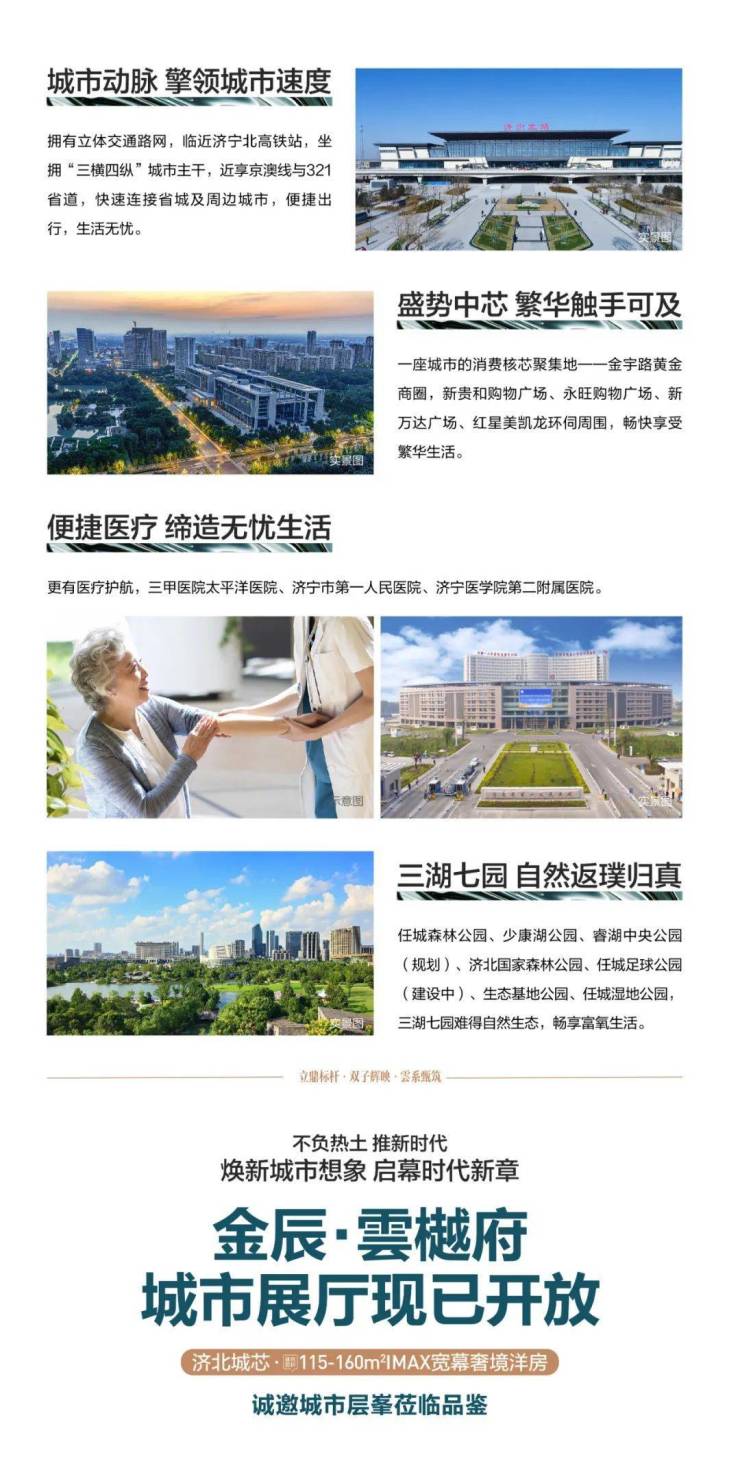 土地资源的占有,成为人居时代进化的沃土,而主城政芯高地更是资源富集、孕育品质生活的理想之地!金辰·雲樾府作为金辰TOP雲系首入济宁的标杆之作,坐享城市级配套。交通、商业、生态、医疗、休闲等全系资源在此集萃。