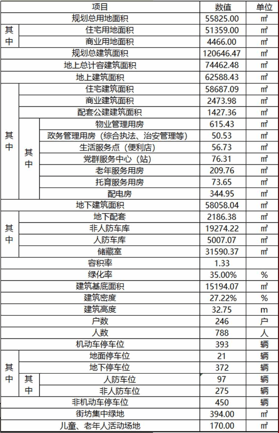 地块为商住用地,项目建设用地面积5.58公顷㎡(约84亩);总建筑面积:120646.47㎡;其中,地上建筑面积为62588.43㎡,地下建筑面积为58058.04㎡;住宅层数为4F、5F和10F,商业配套的层数为2F、4F;容积率为1.33;建筑密度27.22%;绿地率35%;计划总居住户(套)数为246户(套),居住人数约788人(按3.2人/户预算);建筑类型包括住宅、商业、公服配套设施等;规划机动车停车位393个,非机动车位450个。