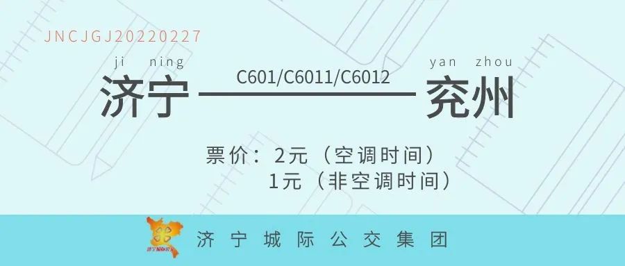 自2022年2月27日起,济宁至兖州C601路、C6011路、C6012路3条城际公交线路票价执行标准如下:
