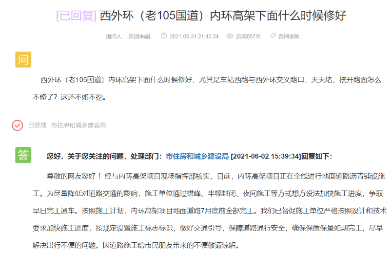 近日,网友通过济宁市网络问政平台咨询,西外环(老105国道)内环高架下面道路什么时候修好?