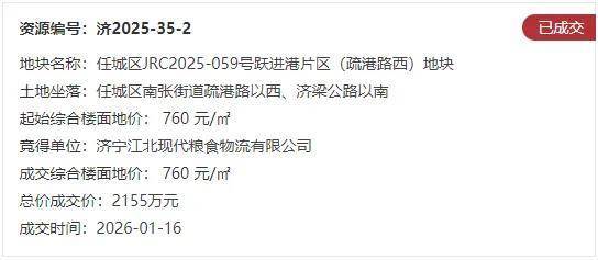 地块名:任城区JRC2025-059号跃进港片区(疏港路西)地块【济宁江北现代粮食物流有限公司竞得】