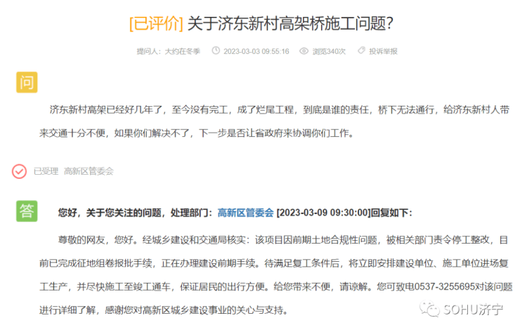 近日,搜狐网济宁小编在济宁市网络问政平台上注意到有网友问政投诉:济东新村高架已经好几年了,至今没有完工,成了烂尾工程,到底是谁的责任,桥下无法通行,给济东新村人带来交通十分不便。
