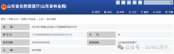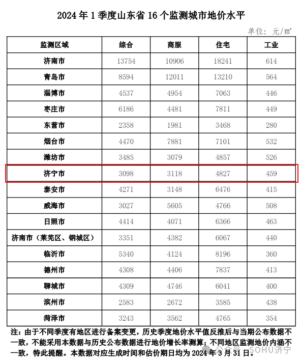 近日,搜狐网济宁小编从山东省自然资源厅了解到,2024年1季度山东省16个监测城市地价水平已发布。其中济宁市综合地价水平3098元/㎡,商服地价水平3118元/㎡,住宅地价水平4827元/㎡,工业地价水平459元/㎡。