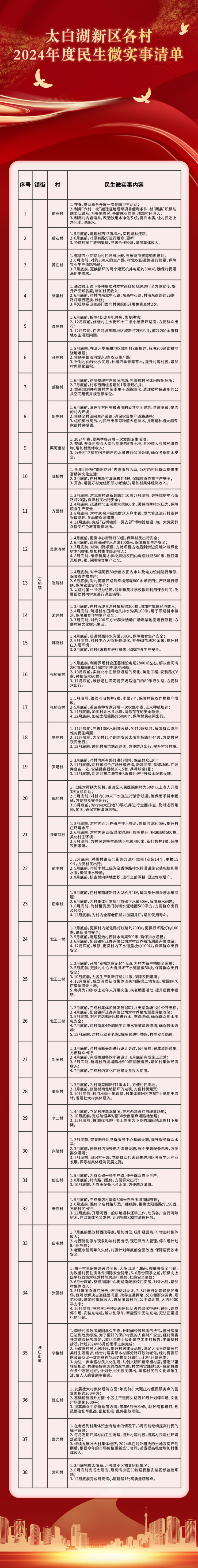 为进一步激励社区“两委”班子干事创业,增强班子的凝聚力、向心力和号召力,提高服务群众水平,做实任期目标和实事承诺工作制度,太白湖新区根据各社区、各村实际,结合全年各项重点任务,研究制定2024年度民生微实事清单,切实解决好人民群众急难愁盼问题,在为民办实事中提升城市基层党建整体效应,让党旗在基层一线高高飘扬。现将2024年度太白湖新区城市社区民生微实事清与太白湖新区各村2024年度民生微实事清单刊发如下。