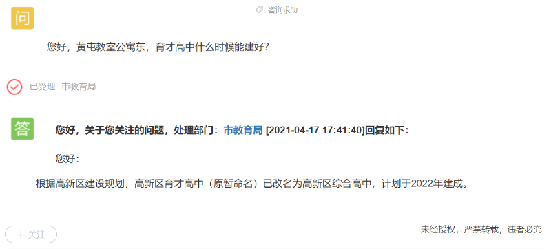 针对网友咨询问题,高新区管委会回复网友称,根据高新区建设规划,高新区育才高中(原暂命名)已改名为高新区综合高中,计划于2022年建成。