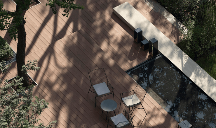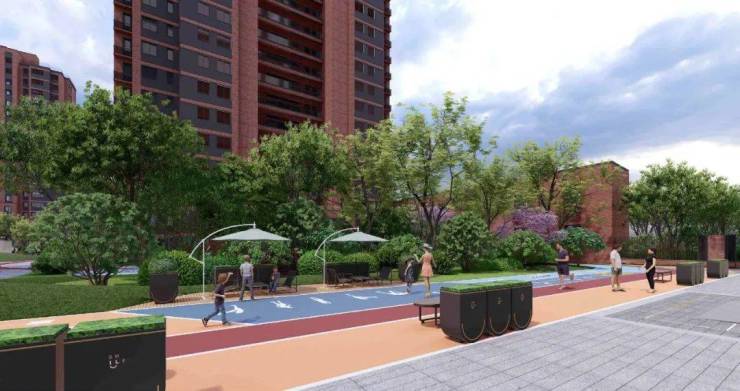 场地铺装上采用仿石砖、塑胶、竹木等对不同功能场地进行分布铺装,形成更加贴近自然、生活的居住氛围。
