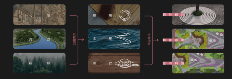 景观建造上采用多层级景观体系,上善若水,以水为媒,以曲线形式将滨水的元素引入小区环境,提取书院 、泗河等兖州当地特色元素 ,提炼融合进景观设计之中,建造一处森居诗意空间 。